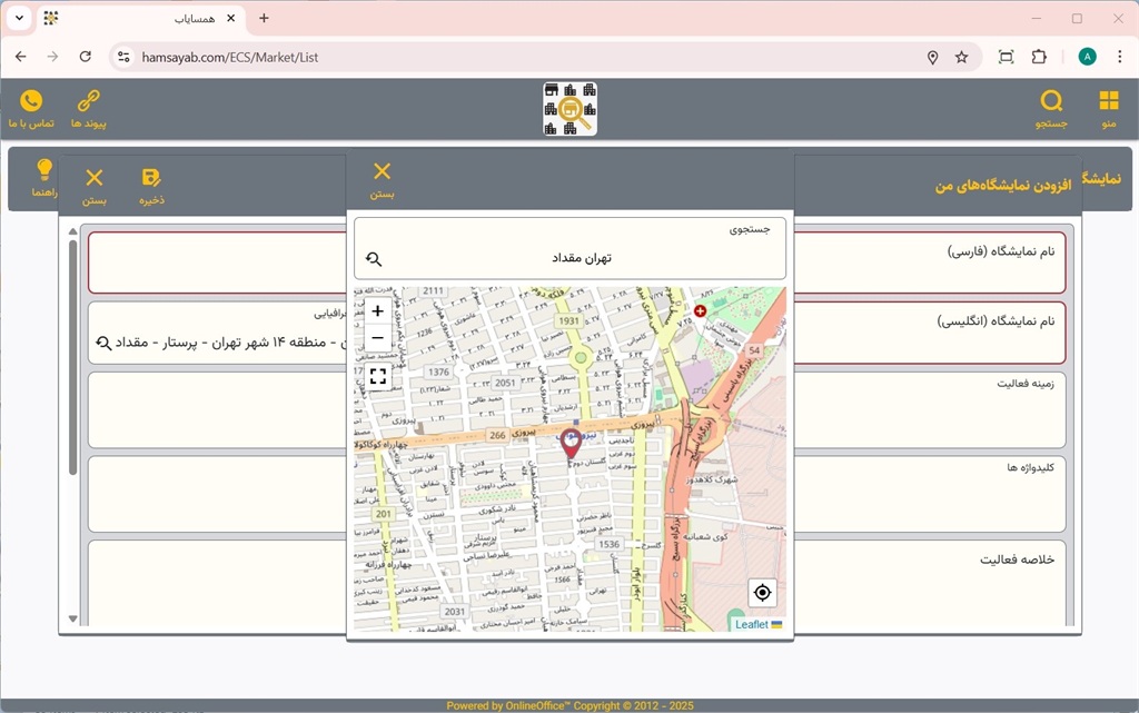 از روی نقشه موقعیت جغرافیایی را انتخاب نمایید. این موقعیت جغرافیایی، محل استقرار نمایشگاه را در جستجوهای کسب و کار و کالا می‌باشد.
